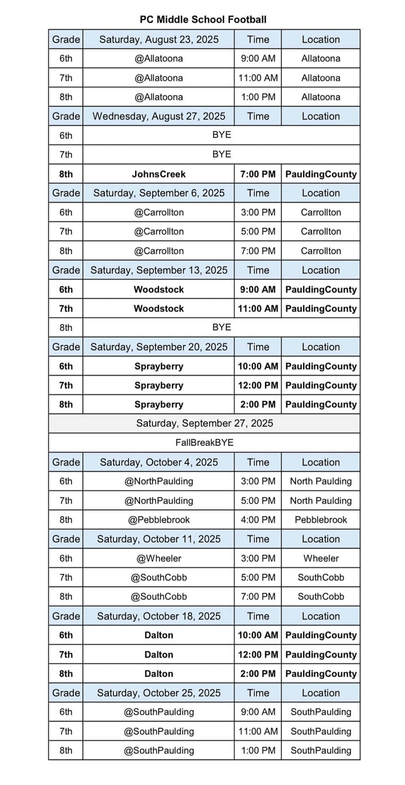 2025 Middle School Schedule